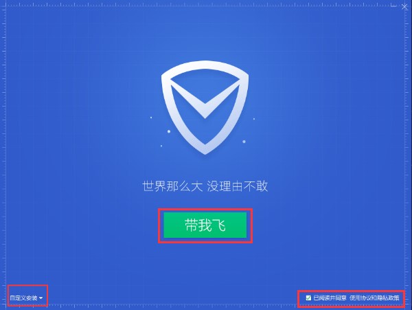 1、首先在本站下载腾讯电脑管家官方版安装包,下载完成后会得到exe安装文件,鼠标左键双击exe文件运行就可以进入腾讯电脑管家安装界面,如下图所示,界面有“带我飞”、“自定义安装”、“已阅读并同意使用协议”三个选项,用户可以点击使用协议进行阅读,阅读完成后就可以开始安装了。