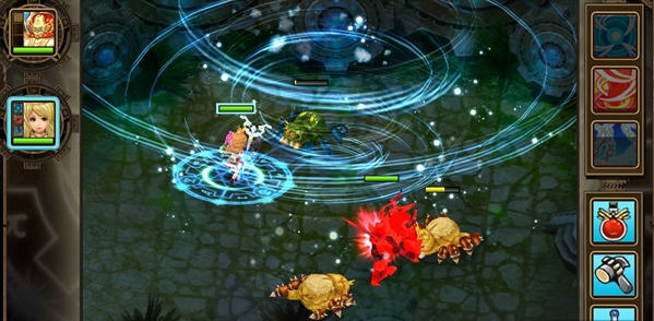 玩家最多可以召唤4名英雄同时出战,一共有13名英雄等待你逐个解锁。点击角色会在屏幕右上方显示技能,点击即可释放。药水等消耗品会在屏幕右下方显示,点击使用。游戏中还会遇到一些木桶和宝箱,打开后会获得额外的奖励。
