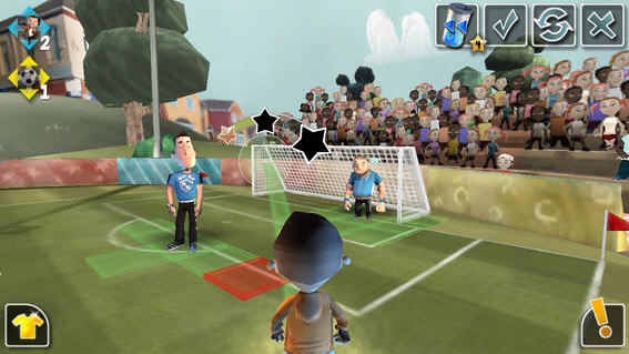 相较于《实况足球》,本作的操作可谓是大相径庭,游戏中操作角色不再是通过虚拟按键自由移动,而是通过点击角色并拖动出移动轨迹来下达移动命令,有点类似于即时战略游戏下达命令的方式。点击地面并拖动则会出现传球的轨迹,松开手指后角色就会完成传球的动作了。而最为关键的射门操作最为简单,只需要持续按住球门就会出现射门的轨迹,然后松手球就会径直而去。